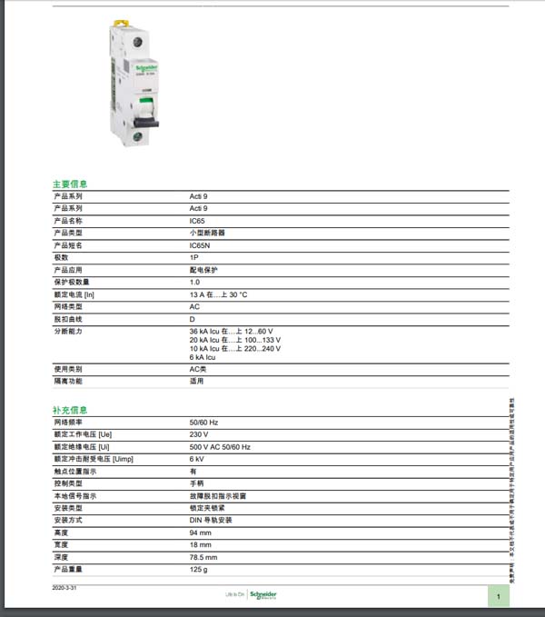 施耐德断路器Schneider C65系列IC65N 1P C10/16/20/25/32/40/63A小型断路器 空气开关空开开关