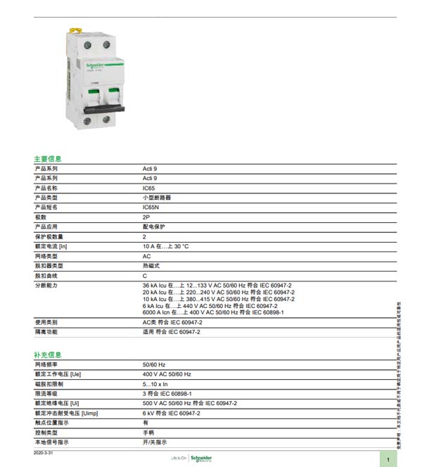 施耐德断路器 Schneider C65系列IC65N 2P C10/16/20/25/32/40/63A小型断路器 空气开关空开开关