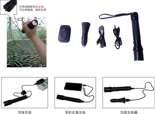 外壳均采用航空级铝合金经硬极氧化处理,壳体硬度高、抗摔、抗碰撞、防腐蚀、散热性能好,产品前端带有自卫功能的攻击头,尾部设计带有安全锤功能;配有市电和车载式充电两种充电方式;必要时可把本产品当作移动电源给手机充电。光源采用美国科锐 LED,具有亮度高、寿命长、低热阻、低功耗等特点。高能无记忆聚合物锂离子电池,容量大、寿命长、自放电率低,健康环保。灯具内部电路设计具有防止过充、过放、短路保护装置,恒流输出的驱动电路,具有短路、开路保护功能,并输出的亮度不随电压的变化而变化。