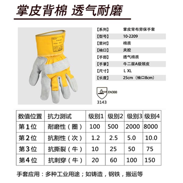 威特仕 WELDAS 焊工手套 10-2209 牛二层A级颈皮款掌皮背布劳保手套电焊手套 M-XL 1副