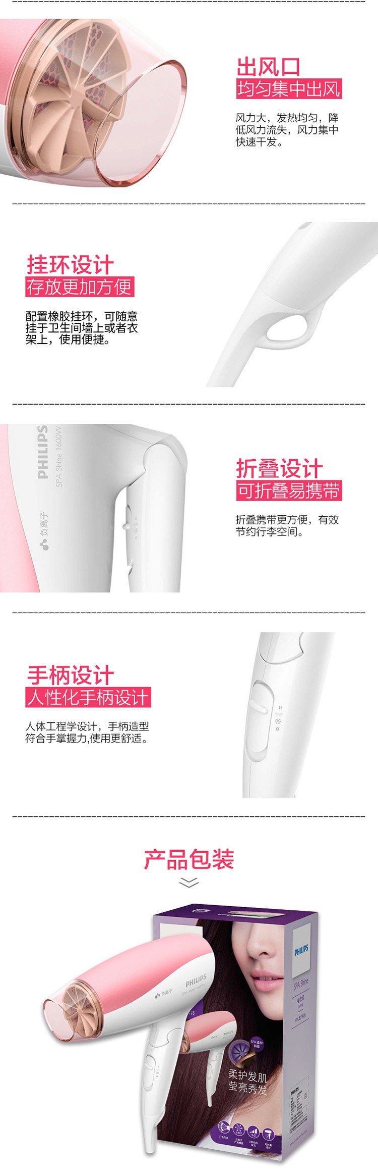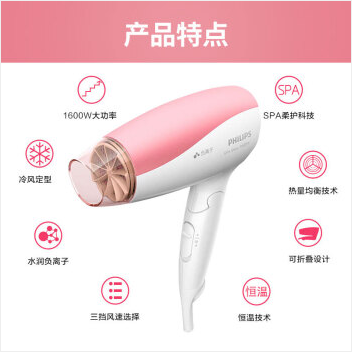 飞利浦(PHILIPS)电吹风机家用大功率负离子恒温冷热风锁水可折叠吹风机可折叠吹风筒 BHC111/05 1600瓦 负离子 可折叠