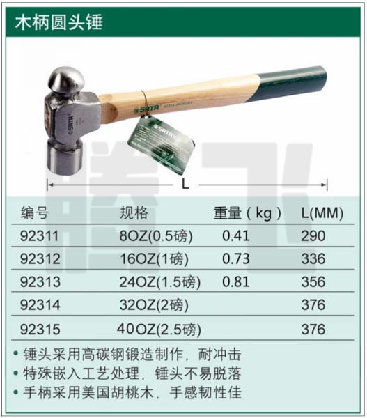 世达(SATA) 92315 木柄圆头锤2.5磅 (计价单位:只)