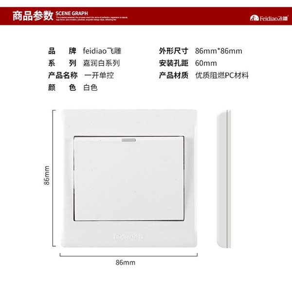 飞雕FEIDIAO 118单开开关插座面板白色家用单控型双开双控灯开关墙壁面板 暗装白色118B30单开