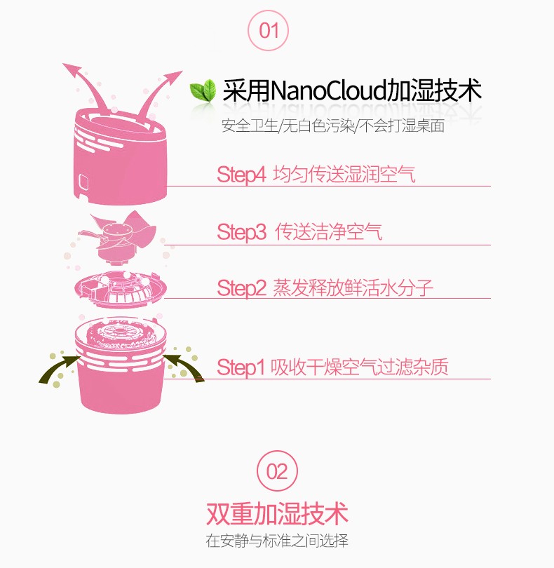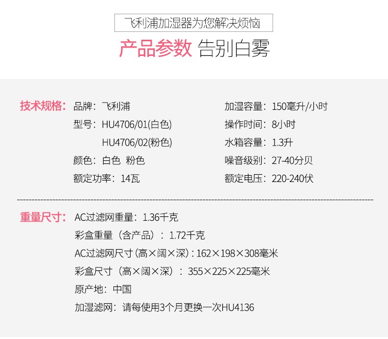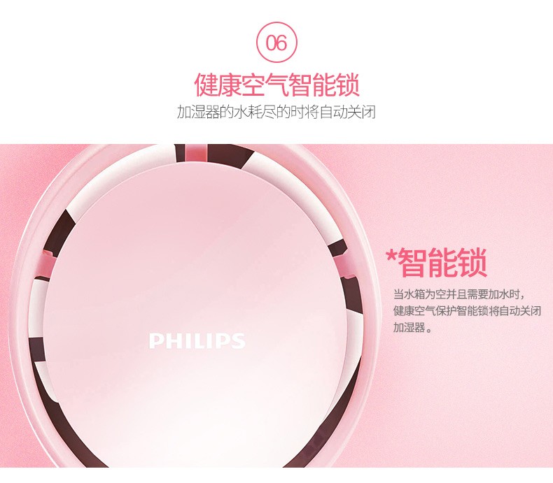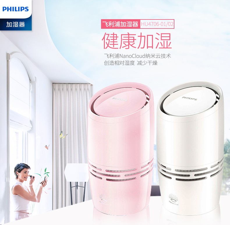 飞利浦(PHILIPS)加湿器 纳米无雾 迷你静音办公室卧室家用加湿 HU4706/01白色HU4706/02粉色