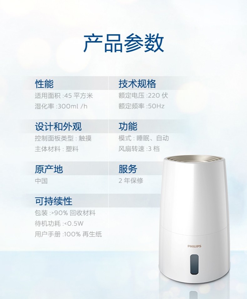 飞利浦(PHILIPS) 加湿器 上加水 纳米无雾恒湿 静音办公室卧室家用加湿 浅绿色HU4801/00机械式-200ml/h