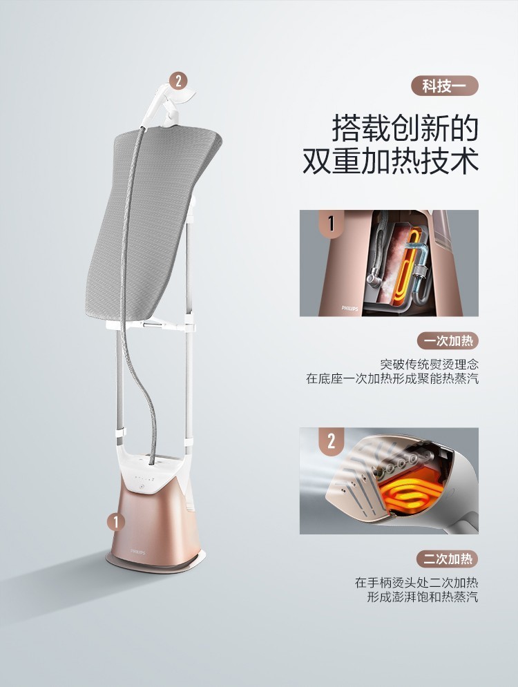 飞利浦(PHILIPS)蒸汽挂烫机 家用双杆手持挂式电熨斗 2000W三档调节烫衣服机 带熨衣板 GC554/38