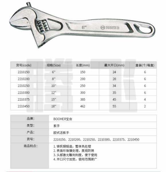 BOOHER宝合 2210150/2210200/2210250/2210300 欧式活扳手6/8/10/12时