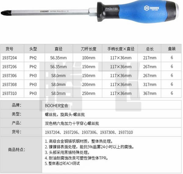 BOOHER宝合 1937310 双色柄六角加力十字穿心螺丝批PH3,8.0×250mm