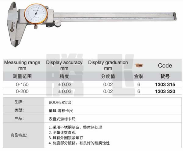 BOOHER宝合 1303315 表盘式游标卡尺0-150mm-0-200mm