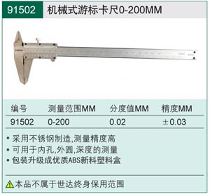 颜色分类: 91501 机械式游标卡尺0-150MM 91502 机械式游标卡尺0-200MM 91503