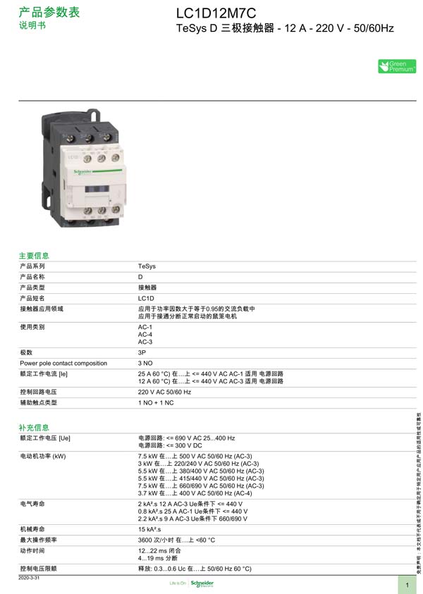 施耐德 Schneider交流接触器LC1-D12M7C LC1D12 12A线圈AC220V 380V