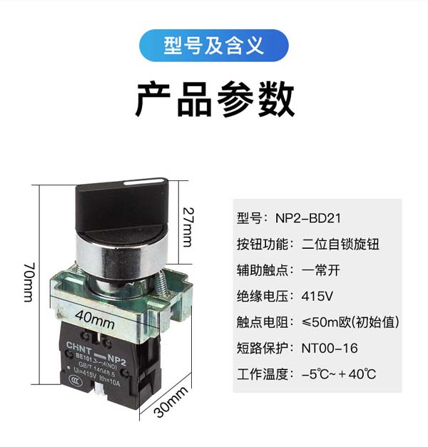 正泰CHNT 按钮NP2-BD25一常开一常闭22mm二位锁定自锁二档旋钮开关 NP2-BD25