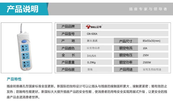 公牛插座(BULL) GN-606A接线板 拖线板 电脑插线板