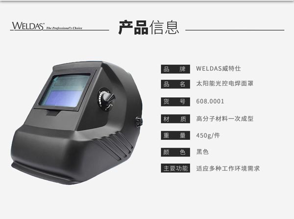 威特仕 WELDAS 电焊面罩 608.0001 焊帽自动变光头戴式氩弧焊焊工电焊帽面具
