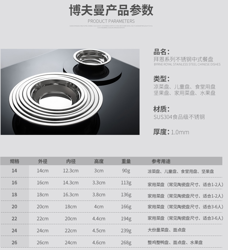 博夫曼/bauformat 304不锈钢盘子 圆盘 24cm 德国菜盘碟子餐盘加厚盘创意家用菜碟汤盘餐具