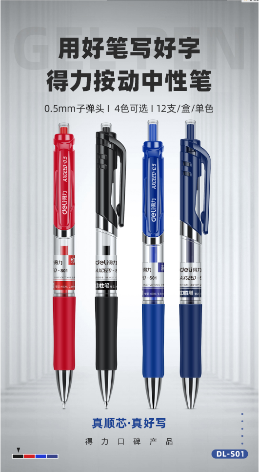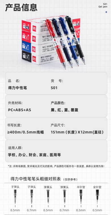 得力S01按动式中性笔黑色0.5mm水笔 办公用品签字笔12支盒