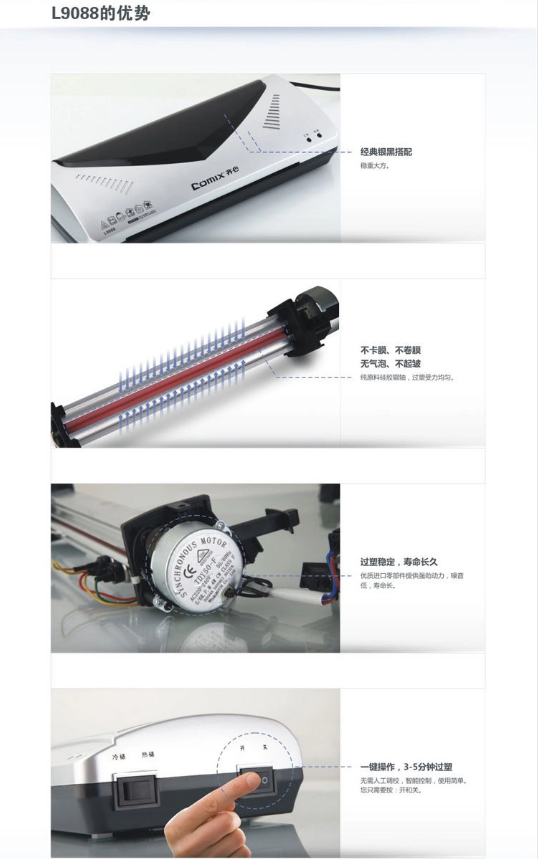 加热快,温度均匀;动力强劲,寿命长久;过塑平整光滑,不起泡