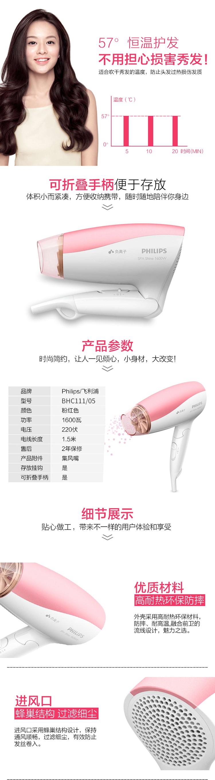 飞利浦(PHILIPS)电吹风机家用大功率负离子恒温冷热风锁水可折叠吹风机可折叠吹风筒 BHC111/05 1600瓦 负离子 可折叠