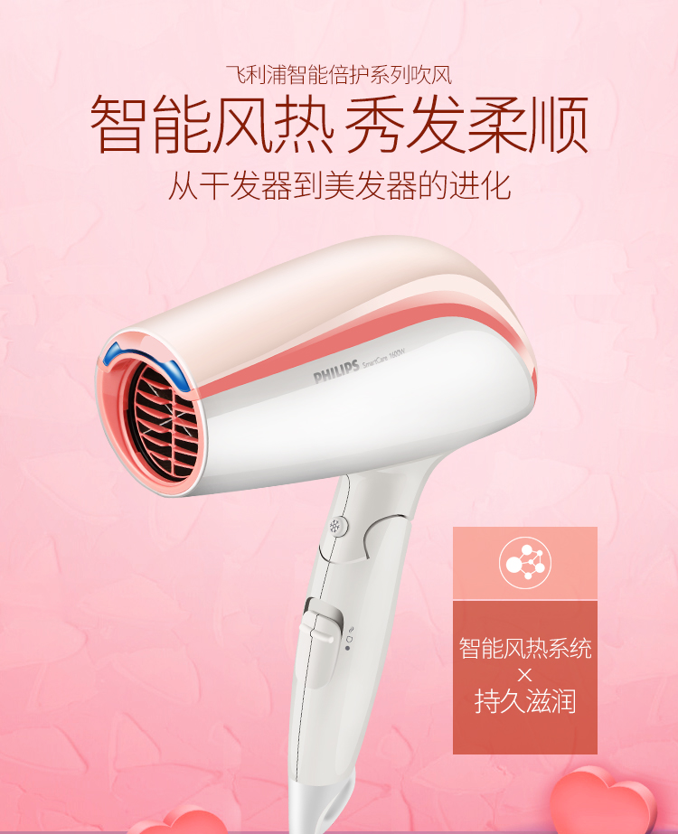 飞利浦 BHC200电吹风机智能冷热风 1600瓦可折叠保护秀发正品