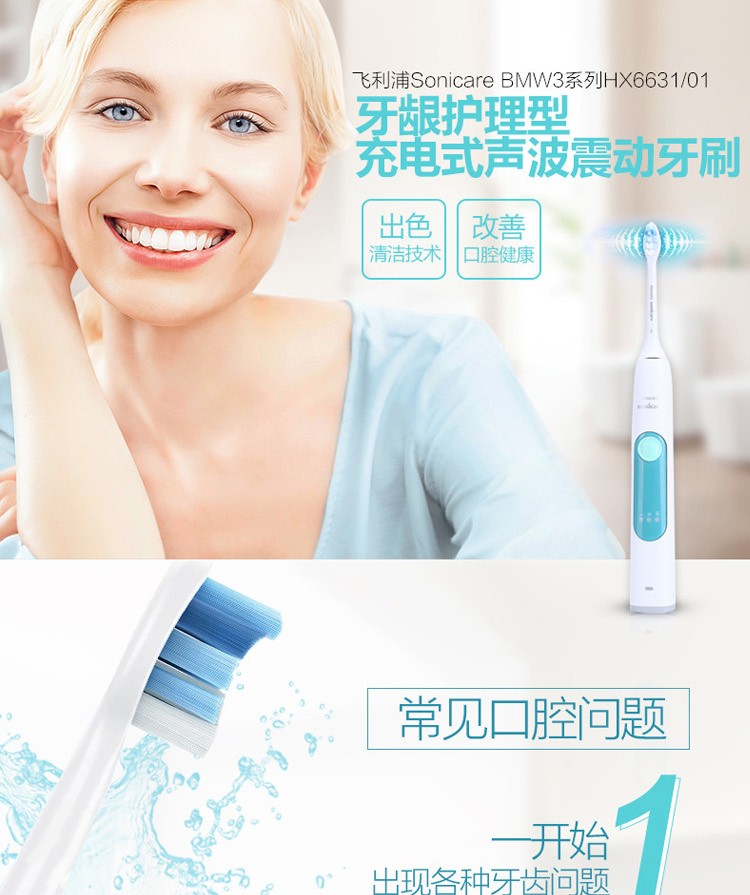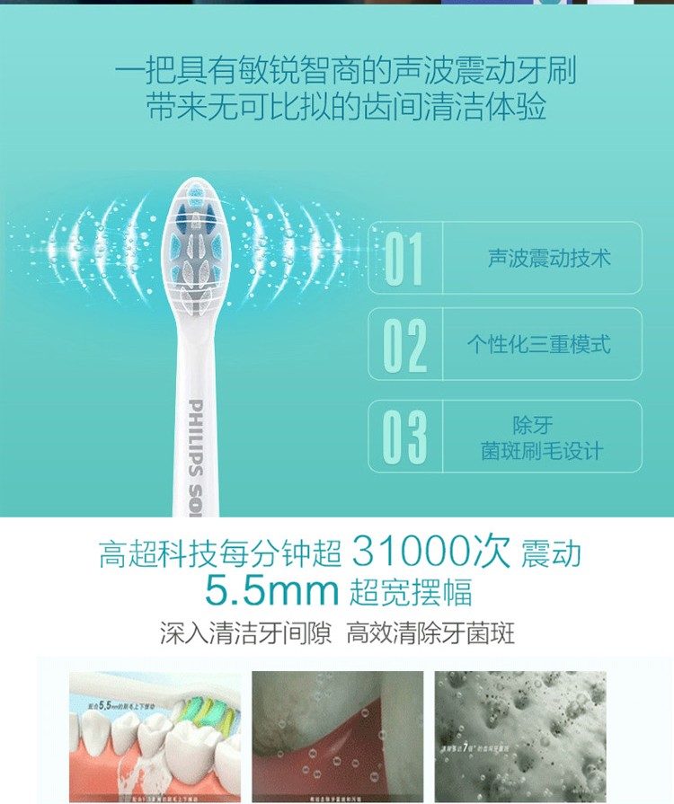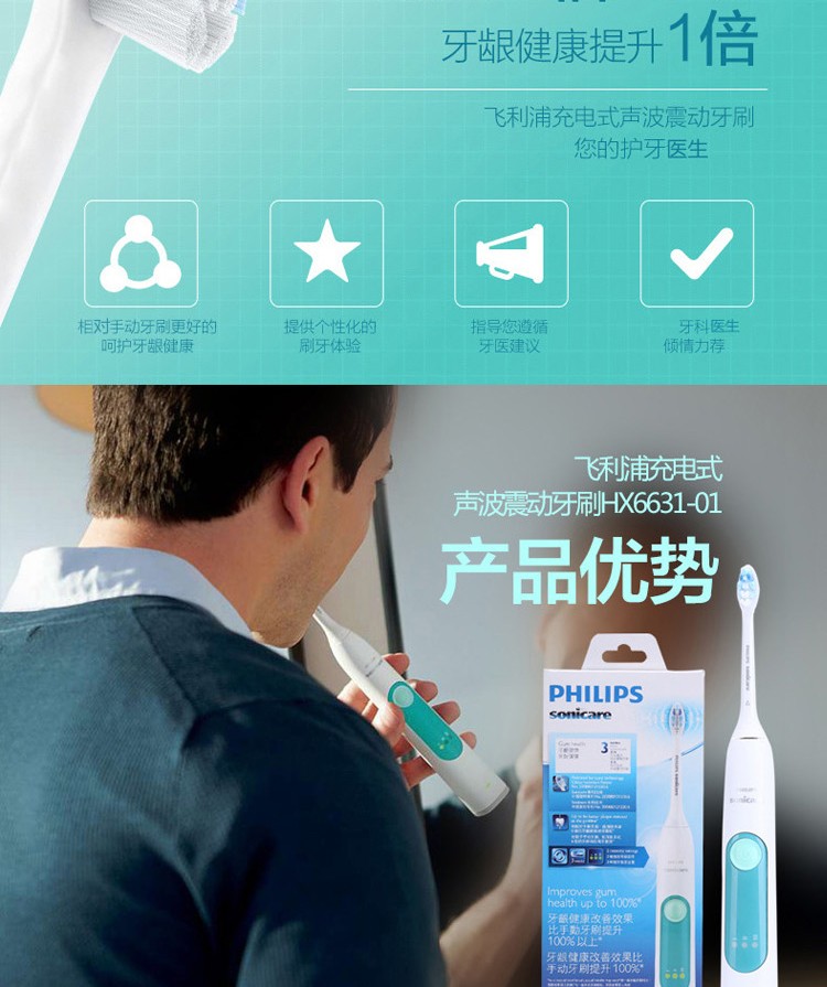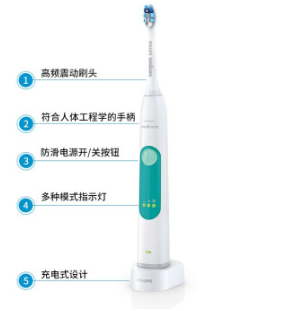 商品名称:飞利浦(PHILIPS)电动牙刷 成人声波震动牙刷 3种强度选择(自带刷头*1) HX6631/01