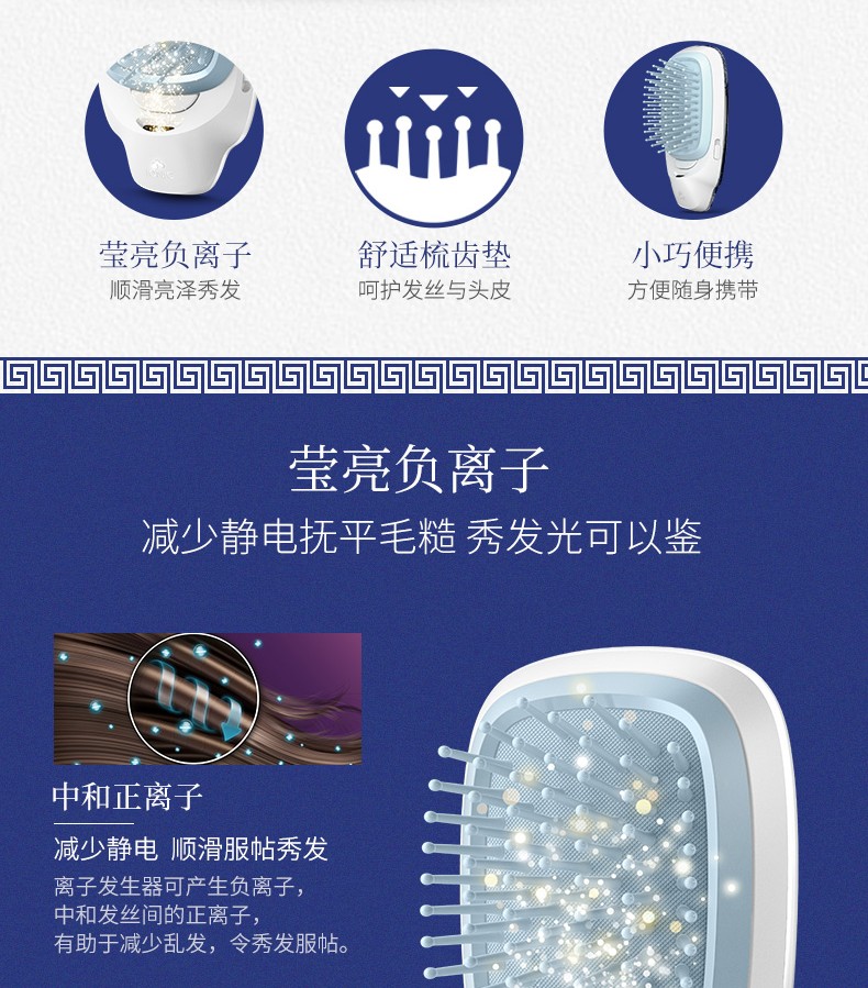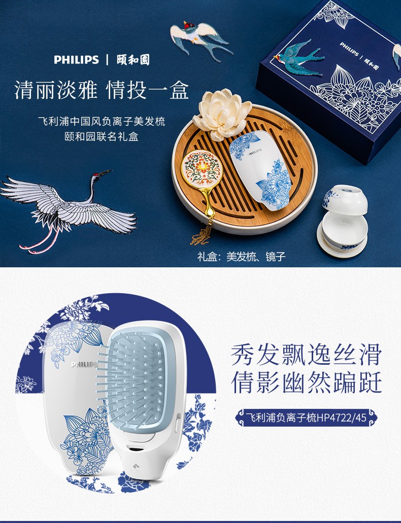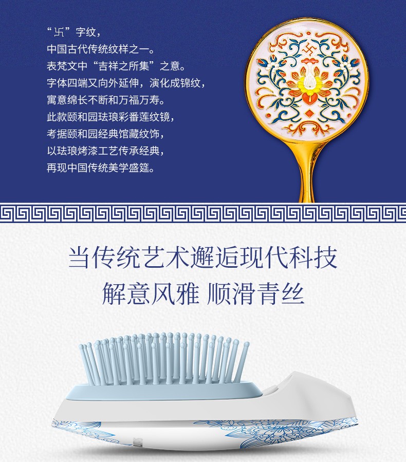 飞利浦(PHILIPS)卷发棒伴侣梳子按摩梳 负离子防静电梳子 颐和园专属礼盒装自带镜子 HP4722/45BP(白地青花)