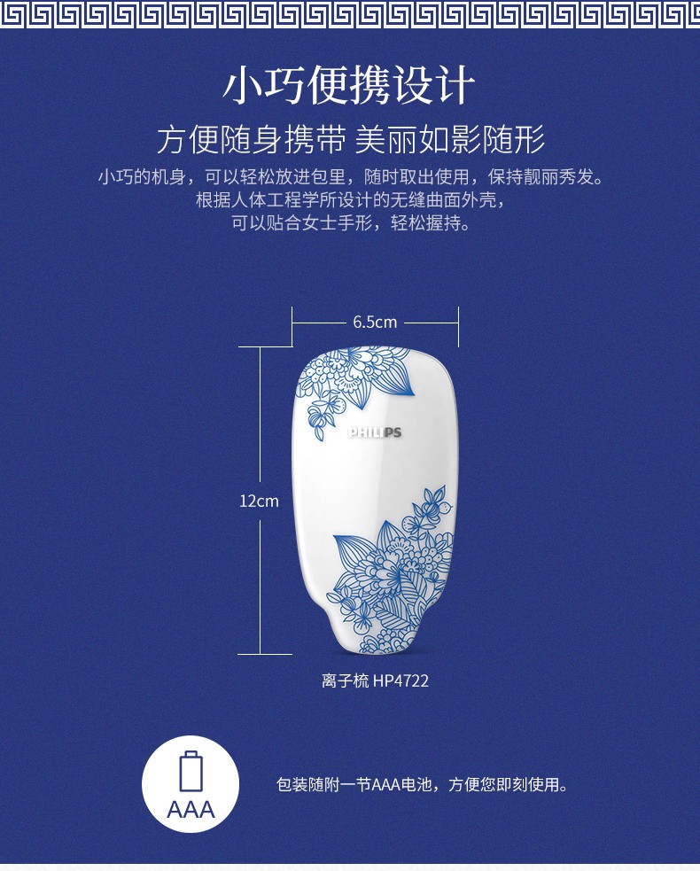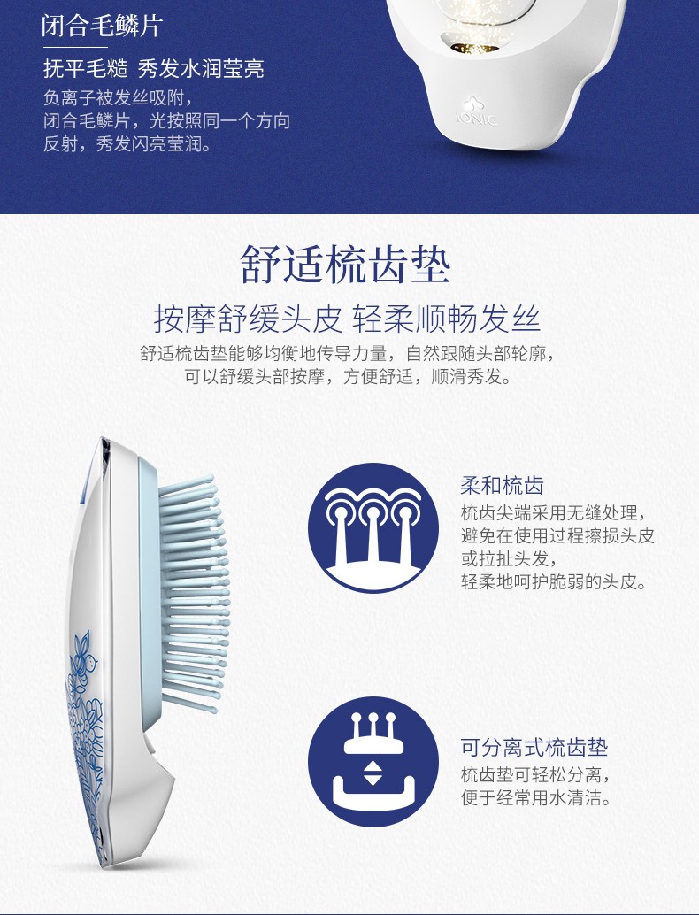 商品名称:飞利浦(PHILIPS)卷发棒伴侣梳子按摩梳 负离子防静电梳子 颐和园专属礼盒装自带镜子 HP4722/45BP(白地青花)