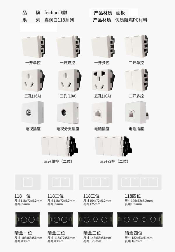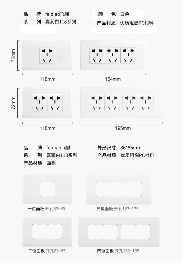 飞雕FEIDIAO 118型五孔插座开关家用118型墙壁五孔插座暗装组合面板单插 暗装白色118B30单插