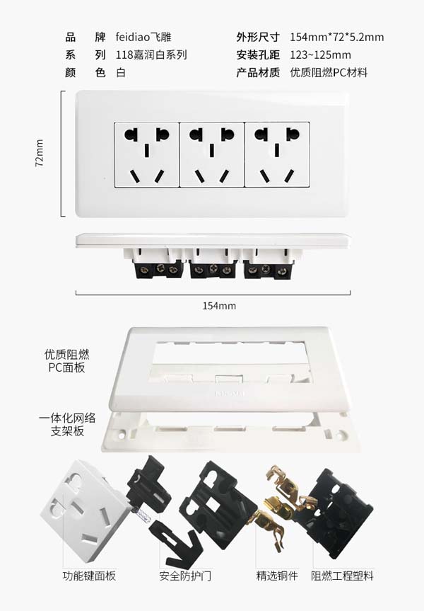 飞雕FEIDIAO 118型五孔插座开关家用118型墙壁五孔插座暗装组合面板单插 暗装白色118B30单插