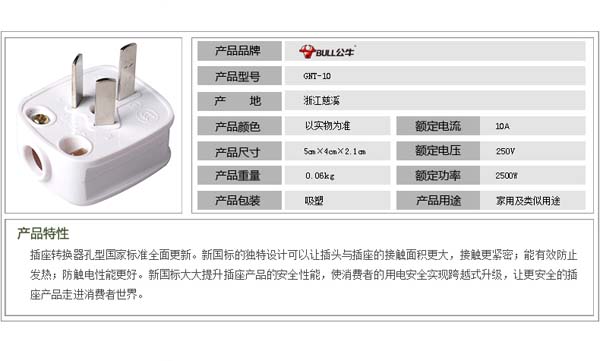 公牛(BULL) GNT-10L4 1极插头220v (计价单位:个)
