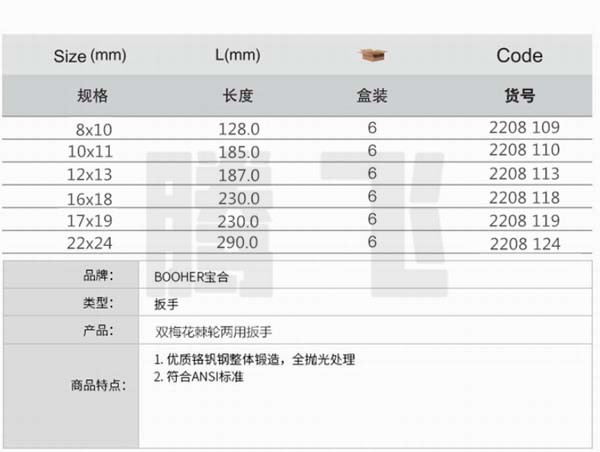 BOOHER宝合 2208109 双梅花棘轮两用扳手8*10/10*1112*13/16*18/17*19/22*24mm
