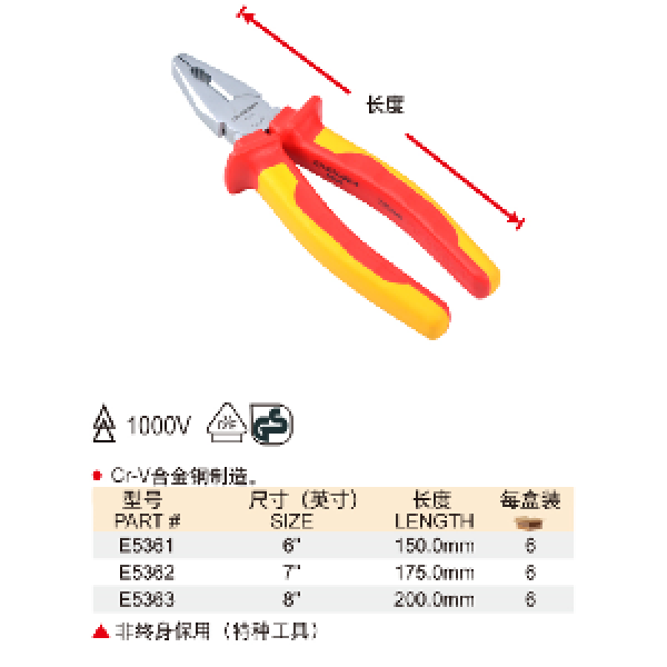 力易得 E5362 VDE双色绝缘钢丝钳7" (单位:个)