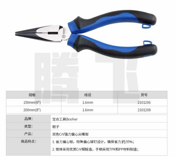 BOOHER宝合 2101206 双色CrV强力偏心尖嘴钳6/8寸