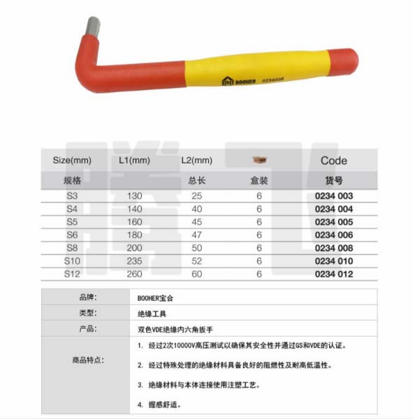 BOOHER宝合 0234003 双色VDE绝缘内六角扳手S3/S4/S5/S6/S8/S10/S12