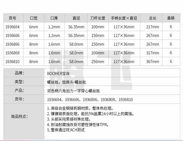 BOOHER宝合 1936810 双色柄六角加力一字穿心螺丝批8.0×250mm