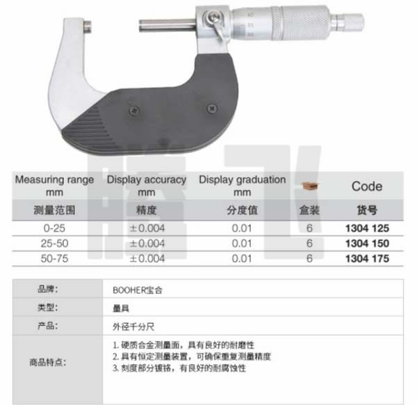 BOOHER宝合 1304175 外径千分尺50~75mm,精度±0.004mm