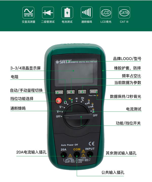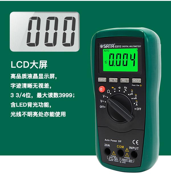 世达 Sata 电工数显 万用表高精度多功能数字全自动量程万能表 03015