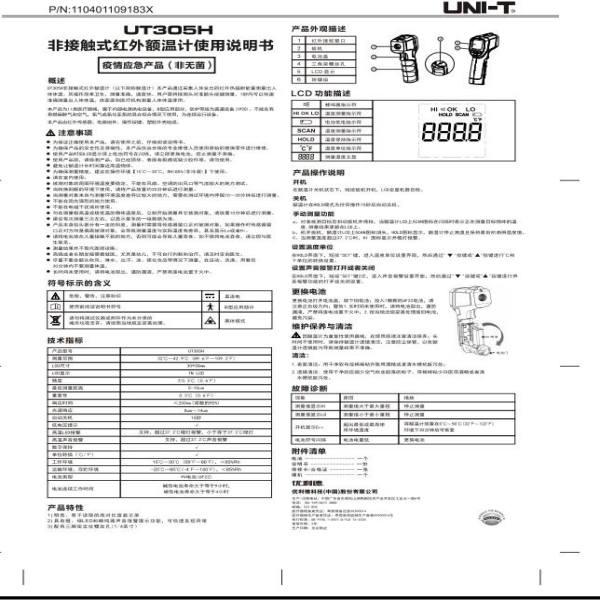 优利德(UNI-T)UT305H 非接触式红外手持额温仪 测温枪 32℃~42.9℃ 测温仪 温度计 电子体温枪